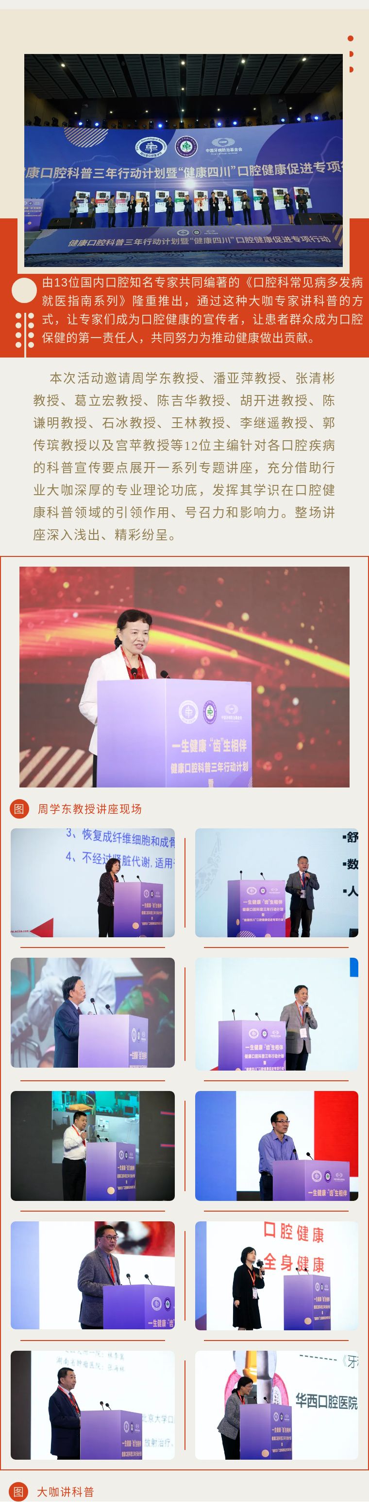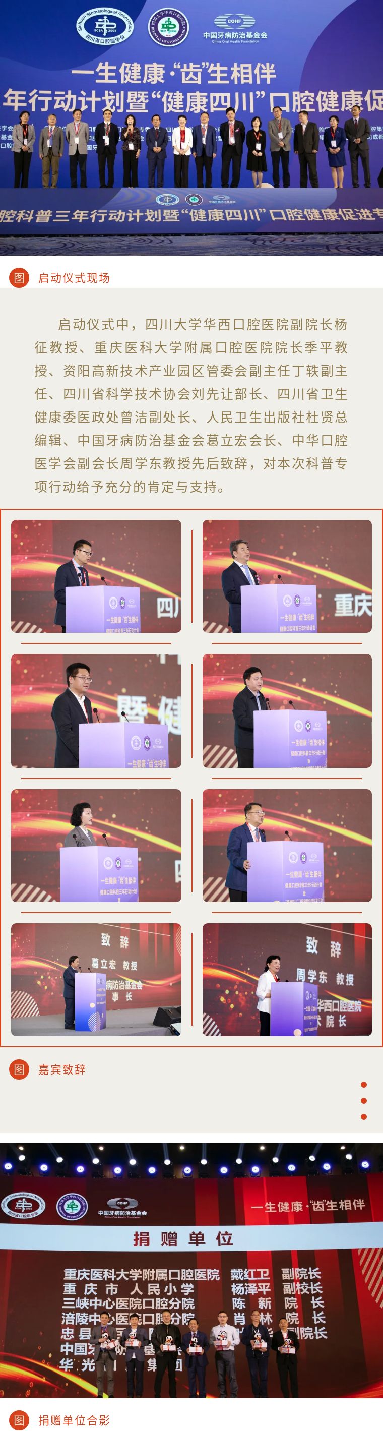 健康中國,科普為先。4月22日上午,四川省口腔醫(yī)學會、中國牙病防治基金會共同牽頭主辦的健康口腔科普三年行動計劃暨“健康四川”口腔健康促進專項行動”在成都西部國際博覽城順利啟動。華光口腔集團作為協(xié)辦單位全程參與了本次活動的籌辦,并進行了書籍公益捐贈,為營造良好的口腔健康科普環(huán)境奉獻一己之力,助力口腔科普行動落地。