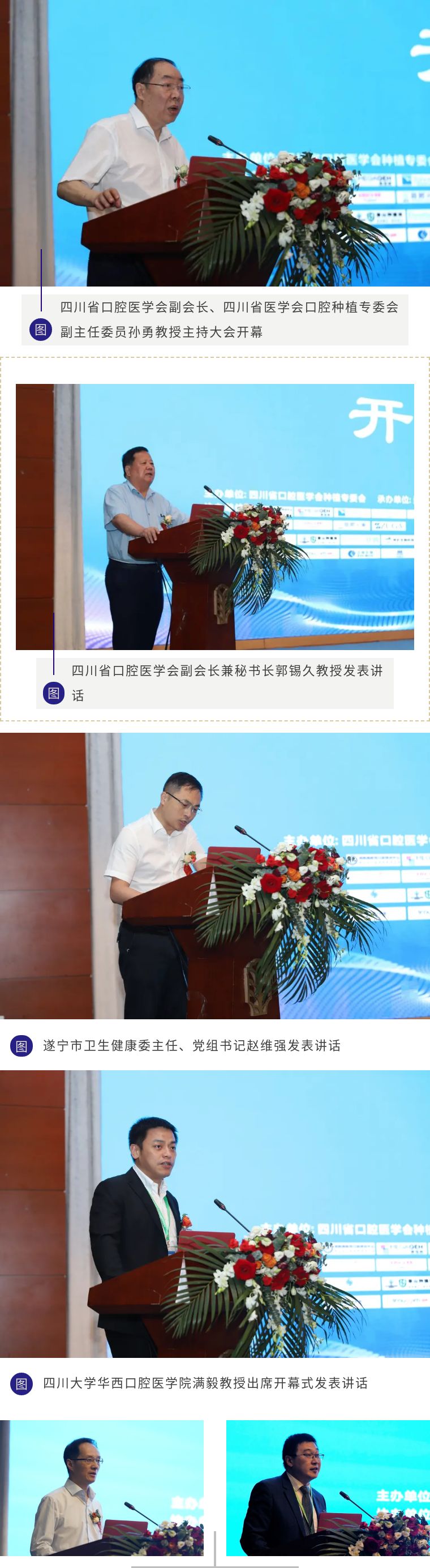 16日上午,開幕式隆重舉行,四川省口腔醫(yī)學(xué)會(huì)副會(huì)長(zhǎng)、四川省醫(yī)學(xué)會(huì)口腔種植專委會(huì)副主任委員孫勇教授主持大會(huì)開幕并致辭。四川省口腔醫(yī)學(xué)會(huì)副會(huì)長(zhǎng)兼秘書長(zhǎng)郭錫久教授、遂寧市衛(wèi)生健康委主任、黨組書記趙維強(qiáng)、四川省口腔醫(yī)學(xué)會(huì)理事、四川省口腔種植專委會(huì)主任委員滿毅教授、遂寧市中心醫(yī)院黨委書記陳擁軍、遂寧市口腔醫(yī)學(xué)會(huì)會(huì)長(zhǎng)、遂寧市中心醫(yī)院口腔醫(yī)學(xué)中心主任楊森等出席了開幕式。