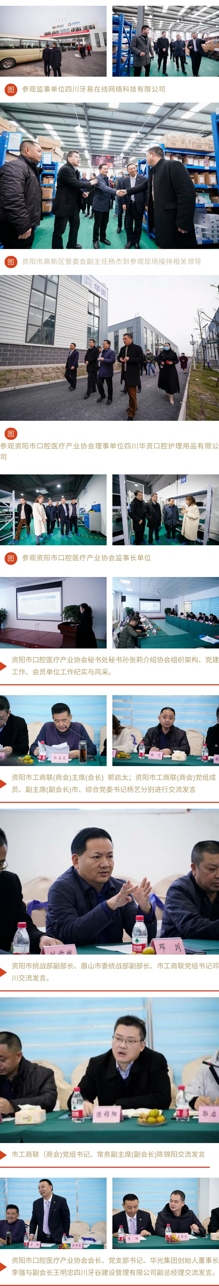 來自眉山市的范松如、劉前線、李亞斌、胡文宜、赴麗勤、潘燕、伍敏、鄧海燕、藺曉東、王璐及資陽市工商聯盟會陳璽、資陽市口腔醫療產業協會的鄒芝、杜先瑜、倪春陽等領導交流發言。