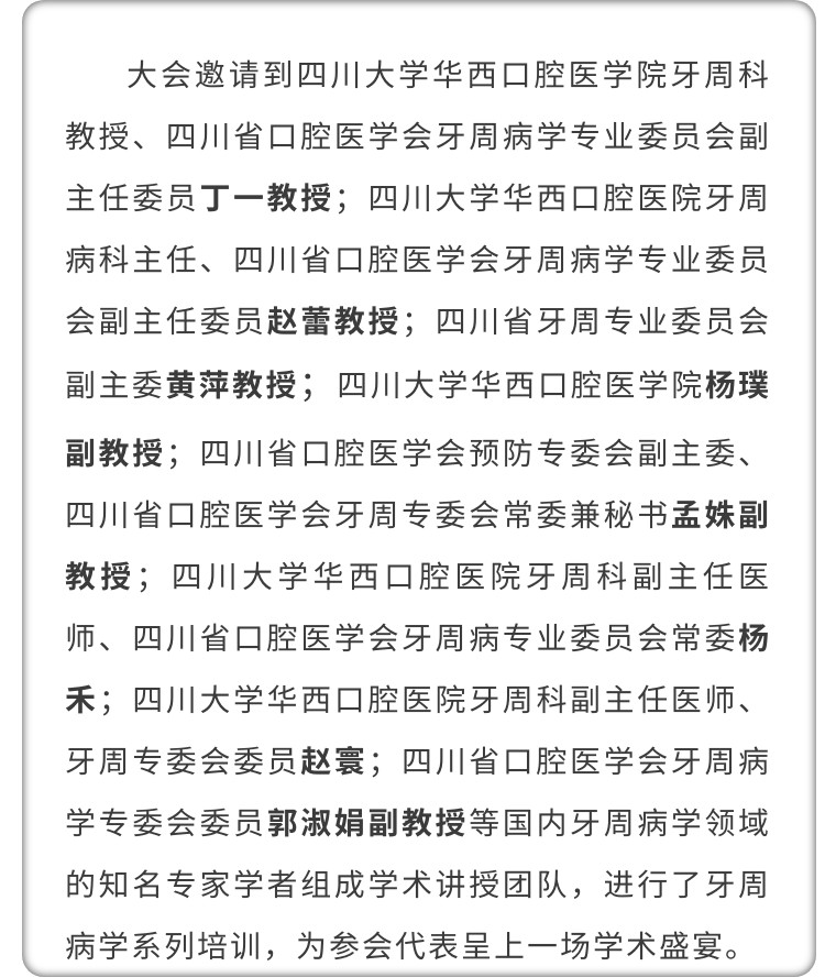 2021年12月17—18日,由四川省口腔醫學會牙周病學專業委員會,國家臨床重點專科四川大學華西口腔醫院牙周病科主辦,綿陽口腔醫院承辦,鼎聚鑫教育咨詢有限公司和華光集團協辦,以及20余家參展商參與支持的《四川省口腔醫學會牙周病學專委會2021年學術年會暨四川大學華西口腔醫院國家臨床重點專科學術論壇》在四川綿陽市順利召開。本次會議憑借其專業性和影響力,匯聚了多名口腔牙周病學領域知名學者,百余位口腔同仁共襄盛舉。